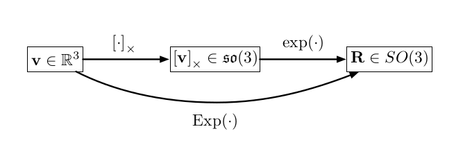p ⊗ q = [ p w q w − p v T q v p w q v + q w p v + p v × q v ] p \otimes q=\begin{bmatrix}p_wq_w-p_v^Tq_v \\ p_wq_v+q_wp_v+p_v×q_v\end{bmatrix}p⊗q=[pwqw−pvTqvpwqv+qwpv+pv×qv]通过四元数的微分方程q ˙ = q ⊗ Ω \dot q=q \otimes \Omegaq˙=q⊗Ω可以看到,四元数与SO(3)一样,可以写作exp映射的形式,并且,两者的旋转向量是一样的,不过对于旋转矩阵的映射而言,首先会将旋转向量映射到so(3)上,之后SO(3)与so(3)通过exp来一一对应,而四元数是将旋转向量先映射到tangent space之后再与四元数进行exp映射