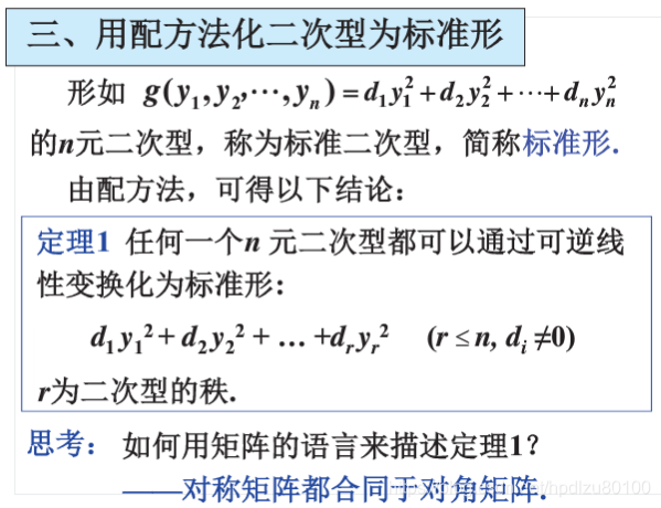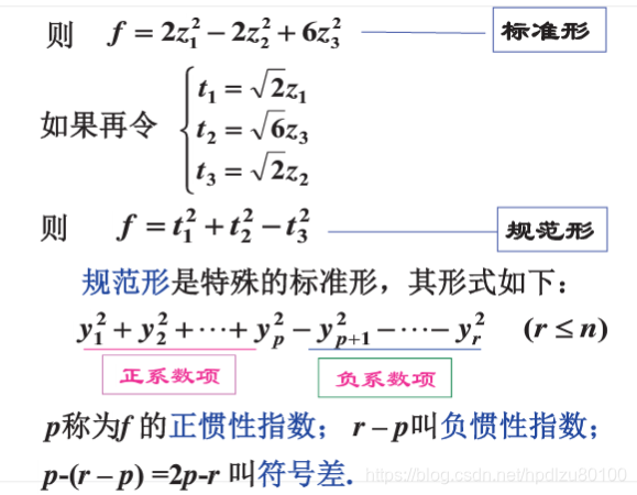 4. 惯性定理:实二次型都可经可逆线性变换化为规范形,规范形是唯一的