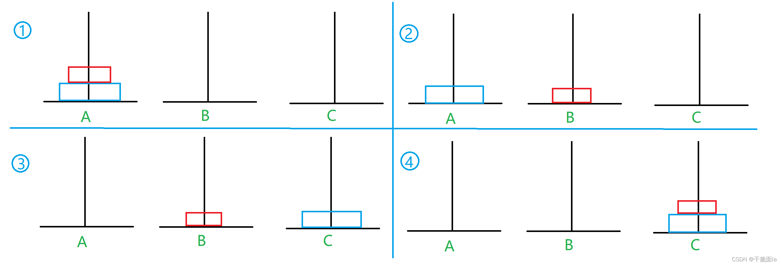对比这三幅图,我们发现从2个圆盘开始,它们都必须经历的操作就是:(1)使n-1个圆盘整体移动到B柱(中转位置)上,(2)再使第n个圆盘移动到C柱(目的位置)上,(3)再将n-1个圆盘整体移动到C柱(目的位置)上。
