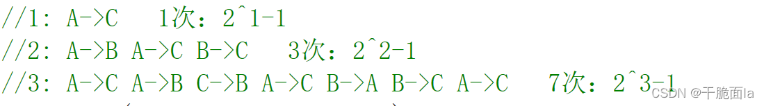2个圆盘: A->B A->C B->C 3次:2^2-1