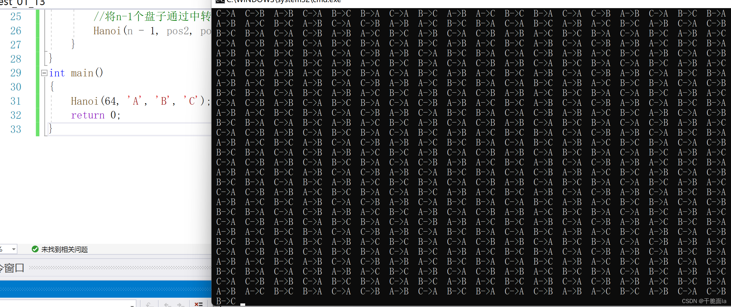 void Hanoi(int n, char pos1, char pos2, char pos3) { //如果只有一个盘子,只需要将盘子从起始位置移动到目的位置上 if (n == 1) { move(pos1, pos3); } //如果有n(n>=2)个盘子,则需要将n个盘子通过中转位置移动到目的位置上 else { //将n-1个盘子通过中转位置移动到目的位置上 Hanoi(n - 1, pos1, pos3, pos2); //将第n个移动到目的位置上 move(pos1, pos3); //将n-1个盘子通过中转位置移动到目的位置上 Hanoi(n - 1, pos2, pos1, pos3); } } int main() { Hanoi(1, 'A', 'B', 'C'); printf("\n"); Hanoi(2, 'A', 'B', 'C'); printf("\n"); Hanoi(3, 'A', 'B', 'C'); printf("\n"); return 0; }4.3 完整代码