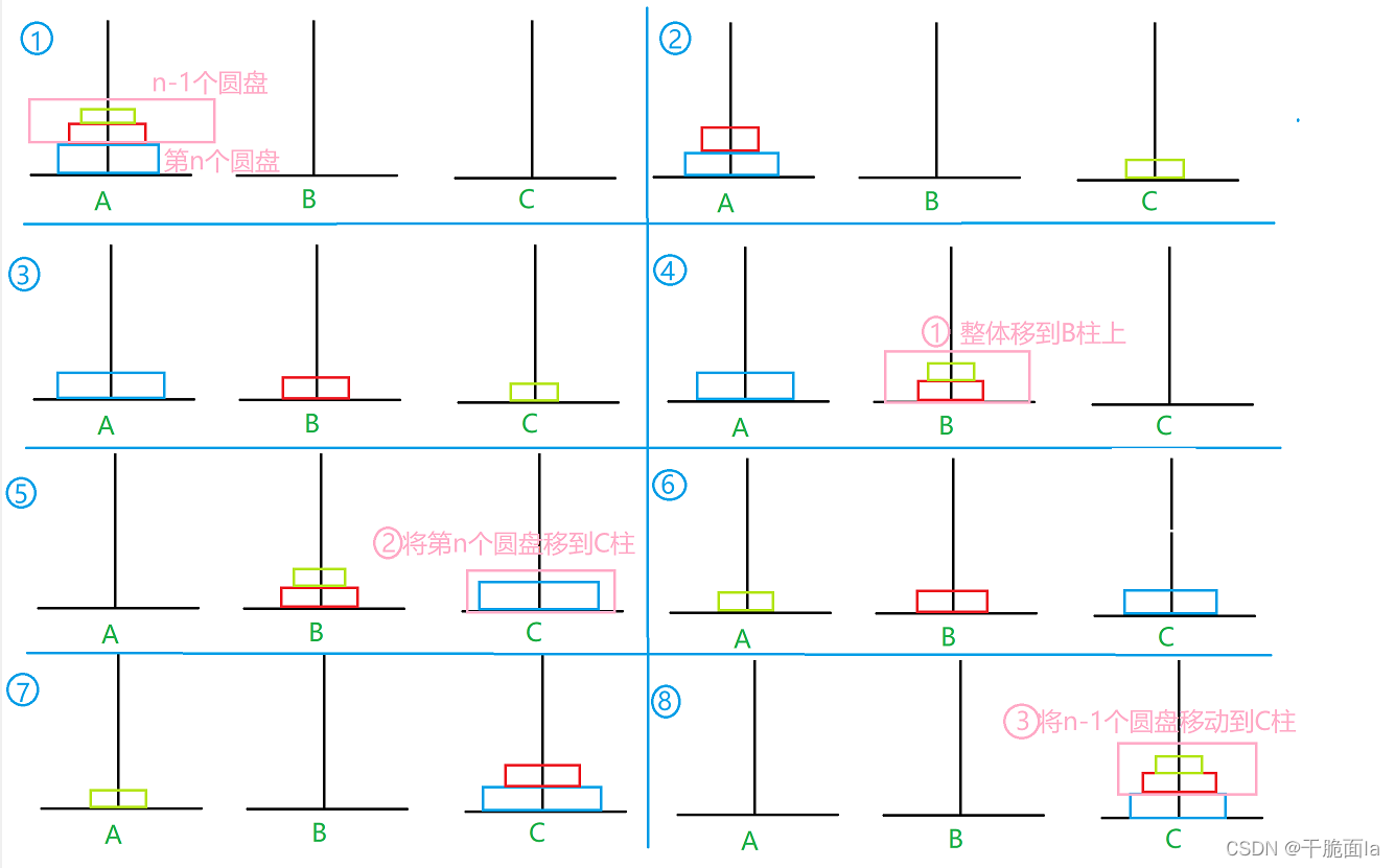 上一操作中的第(1)步又可以细分到:将n-2个圆盘通过 (1)使n-2个圆盘整体移动到C柱(中转位置)上,(2)再使第n-1个圆盘移动到B柱(目的位置)上,(3)再将n-2个圆盘整体移动到B柱(目的位置)上。