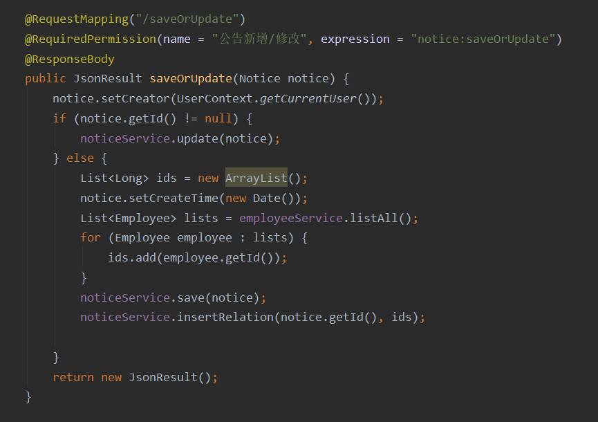- 随后进行中间表新增关系的操作(传2个参数,一个是公告表id,一个是用户们的ids集合进去,在中间表则一波增加数据)