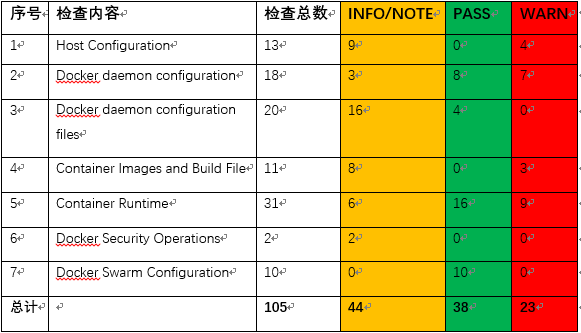 考虑到这里的检测,并未覆盖到第5章中Container Runtime相关的内容,因此在测试环境中,我们运行一个容器,再来进行一下测试,结果如下表所示。