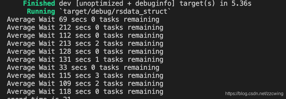 println!("Average Wait {} secs {} tasks remaining",averageWait,printQueue.size_of());