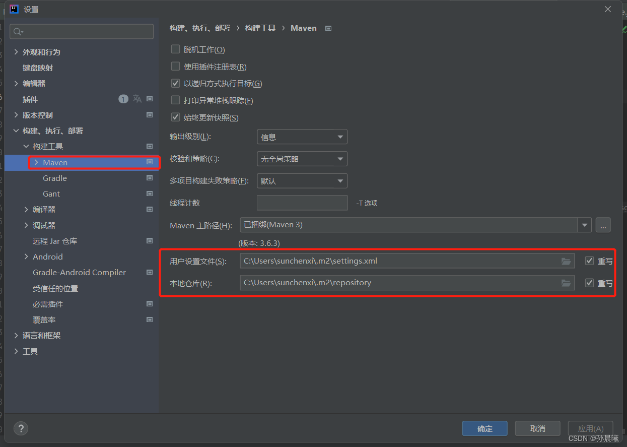 </mirror>2保存后,打开idea的设置,选择maven,用户设置文件和本地仓库都重写,位置为刚才放置的settings文件的位置,应用然后保存