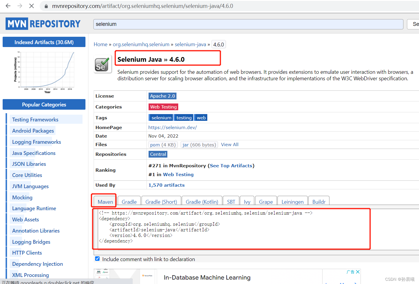 第一步:打开《https://mvnrepository.com/artifact/org.seleniumhq.selenium/selenium-java/4.6.0》,搜索selenium,选择需要的selenium版本,打开maven页签,复制里边的内容粘贴在idae中之前打开的porm文件中