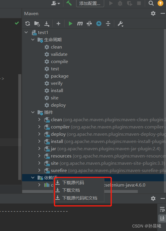 第二步:查看右侧的maven的内容,看是否下载下来了,未下载的话可以尝试刷新上边的刷新按钮,或者鼠标放到依赖上,右键,选择下载源文档或者文件或者全部