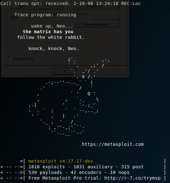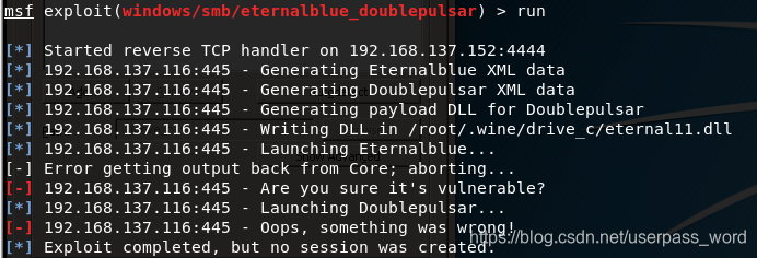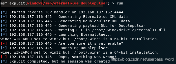 使用这个模块本来是用来做攻击测试的,但是我始终没有测试成功,我大概花了1天半的时间,一直在研究为什么网上的文章里都显示测试成功了,我的就没有成功,一直在找原因,因为除了时间上的差异,kali模块增多,高版本的wine32软件,我真的不知道到底问题出在哪里了,就真的只好从这些方面入手去排查,从问题出发找原因,这个真的需要耐心,毅力。