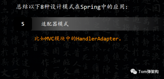 在Spring,只要是以Adapter命名的类基本都是适配器模式的应用。比如MVC模块中的HandlerAdapter。