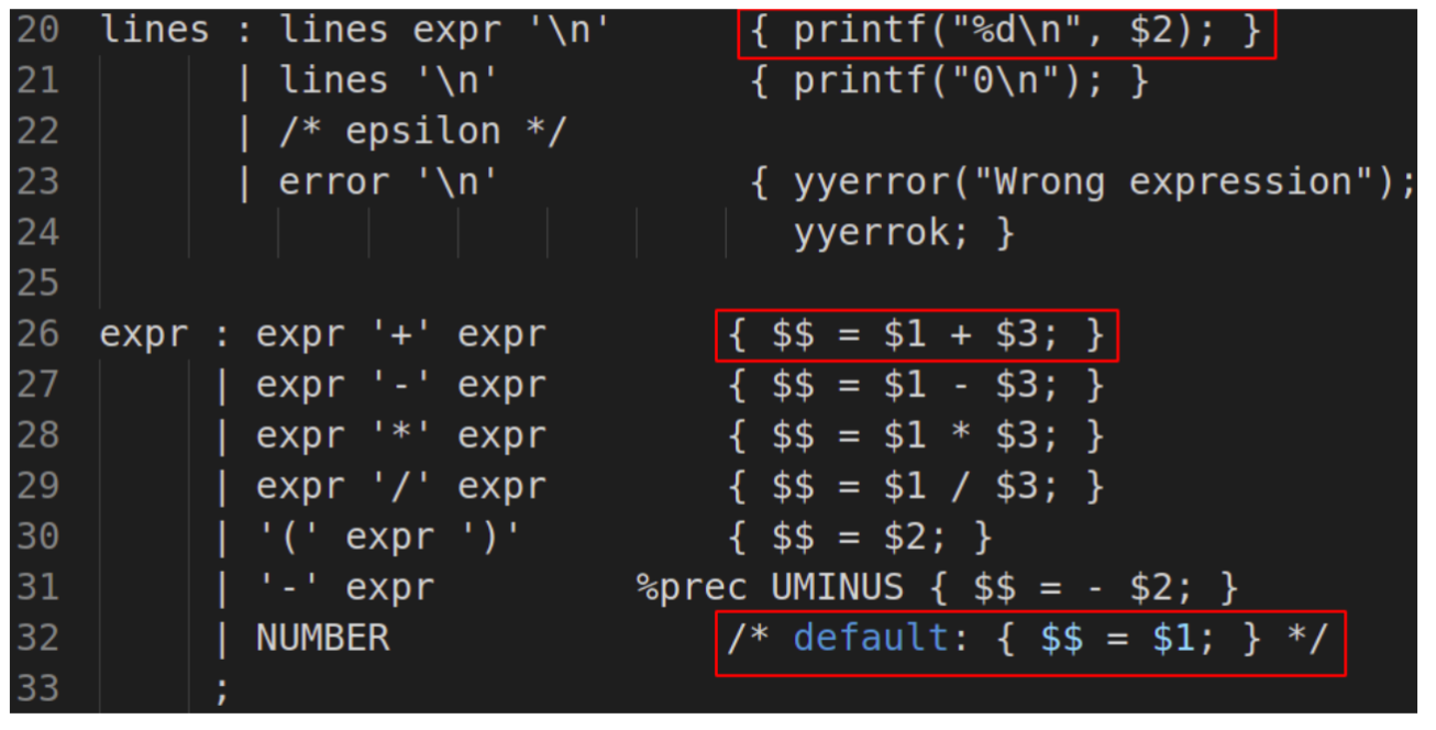 - 产生式的结合性与优先级被设定为它的最右终结符号的结合性与优先级:减号,我们定义下面的表达式的优先级和UMINUS是一样高的。