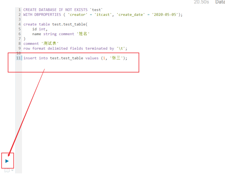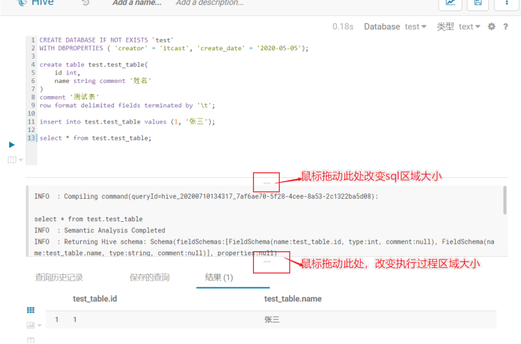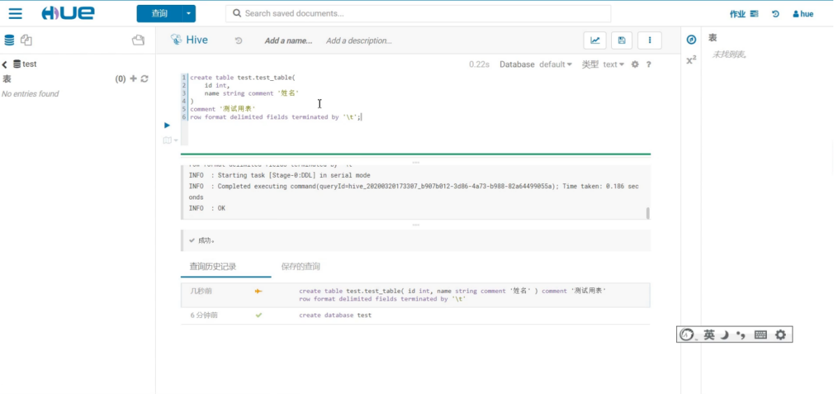 create table test.test_table( id int, name string comment '姓名')comment '测试表'row format delimited fields terminated by '\t'; |