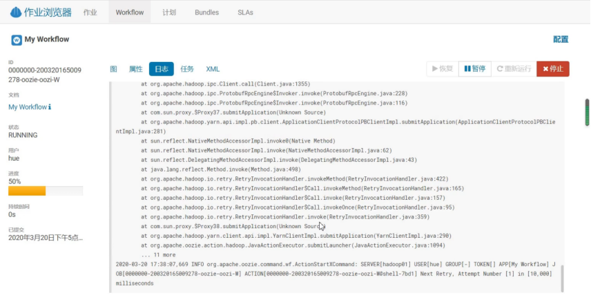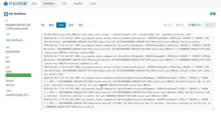 6.两者均可以通过WEB界面进行配置操作,Azkaban和Oozie均拥有自带WEB,而Oozie同时还被HUE集成,通过HUE集成管理,可以更加方便的在Web页面上完成workflow的启动、停止、恢复。