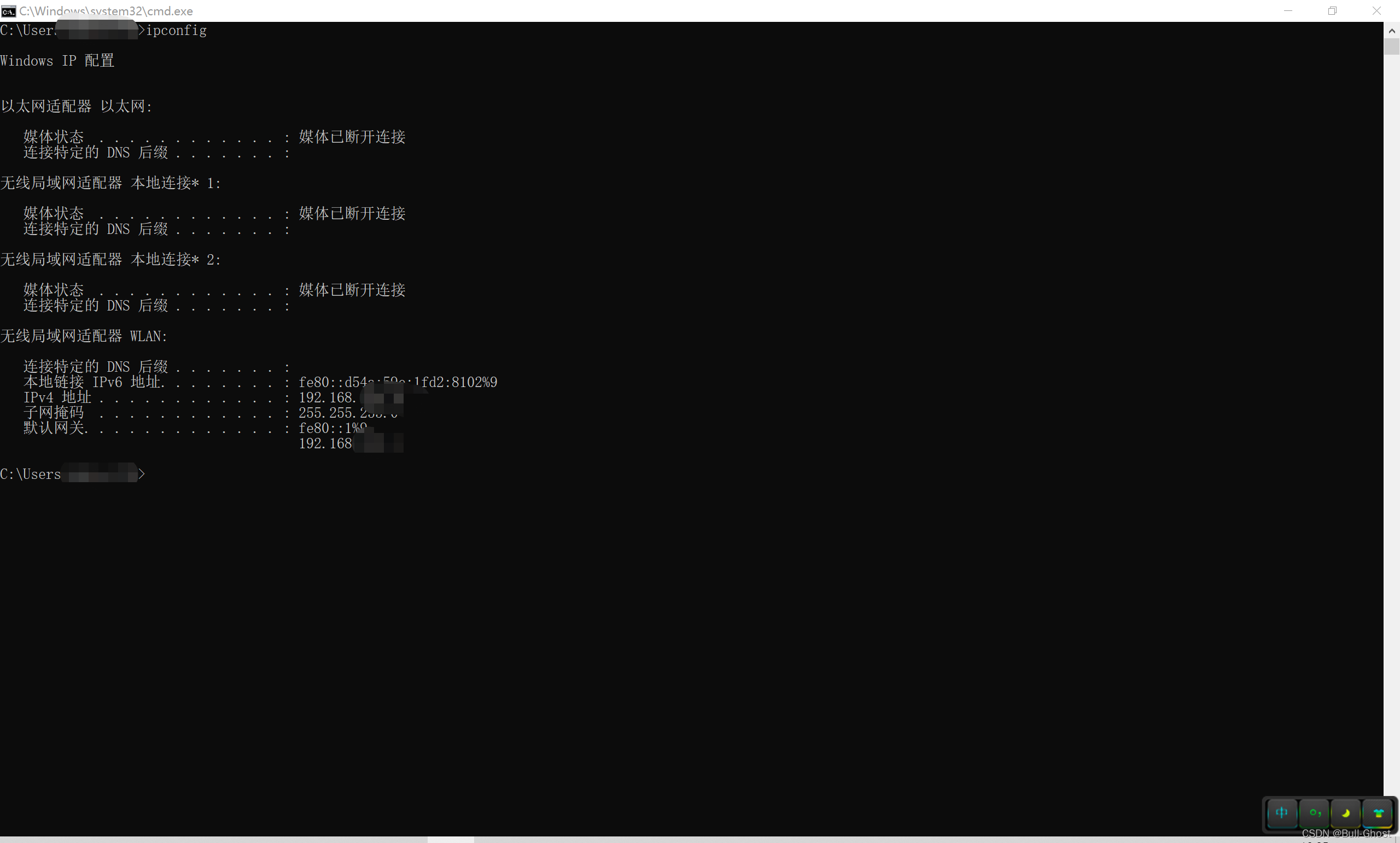 输入ipconfig或者ipconfig/all查看ip基本信息 ,并记录信息中的 ipv4地址,子网掩码,默认网关,DNS服务器,我们下一步要用得到。