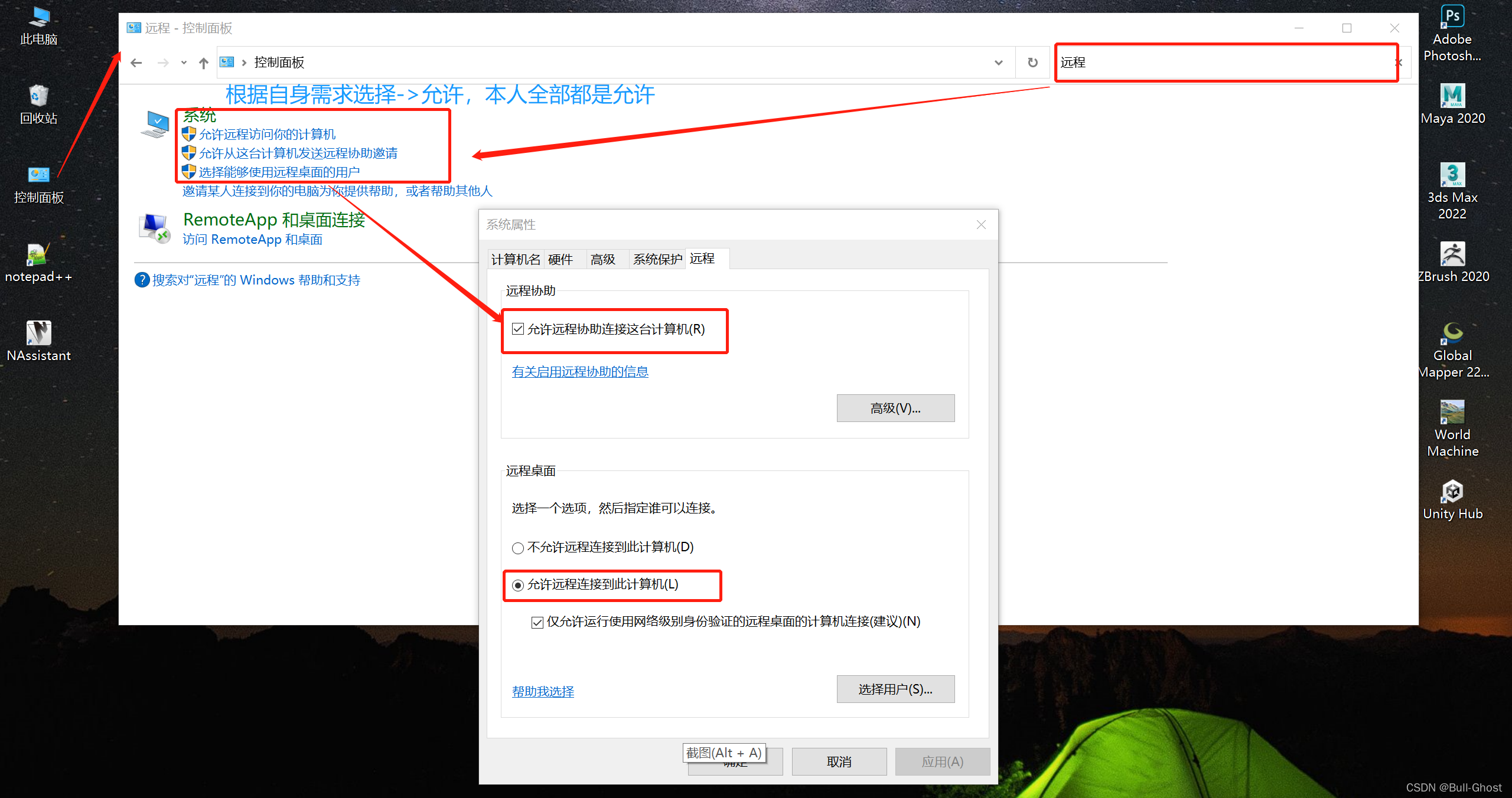 注意:控制端需要“允许从这台计算机发送远程协助”,被控制端需要“允许远程访问你的计算机”