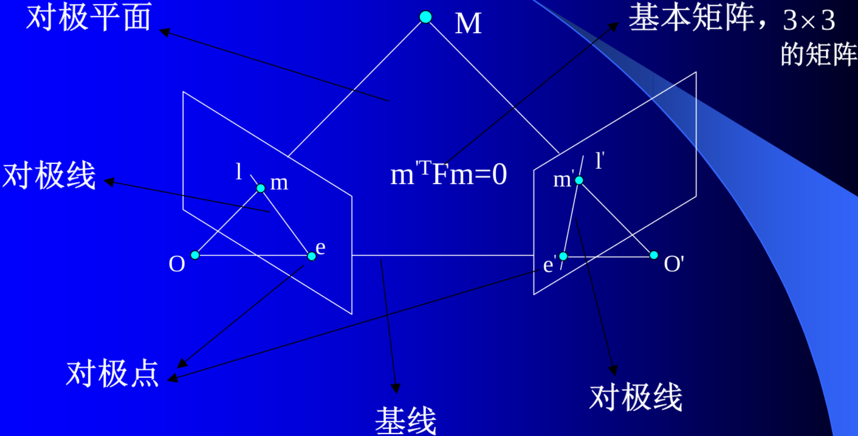 (1)我们可以看到,对极平面(O O ′ M OO^{'}MOO′M)其实是有五个位置点确认的一个平面,五个位置点分别为(O , O ′ , I , I ′ , M O,O^{'},I,I^{'},MO,O′,I,I′,M)简单来说由着五个点共面来约束现在的对极平面(O O ′ I ′ M I OO^{'}I^{'}MIOO′I′MI)