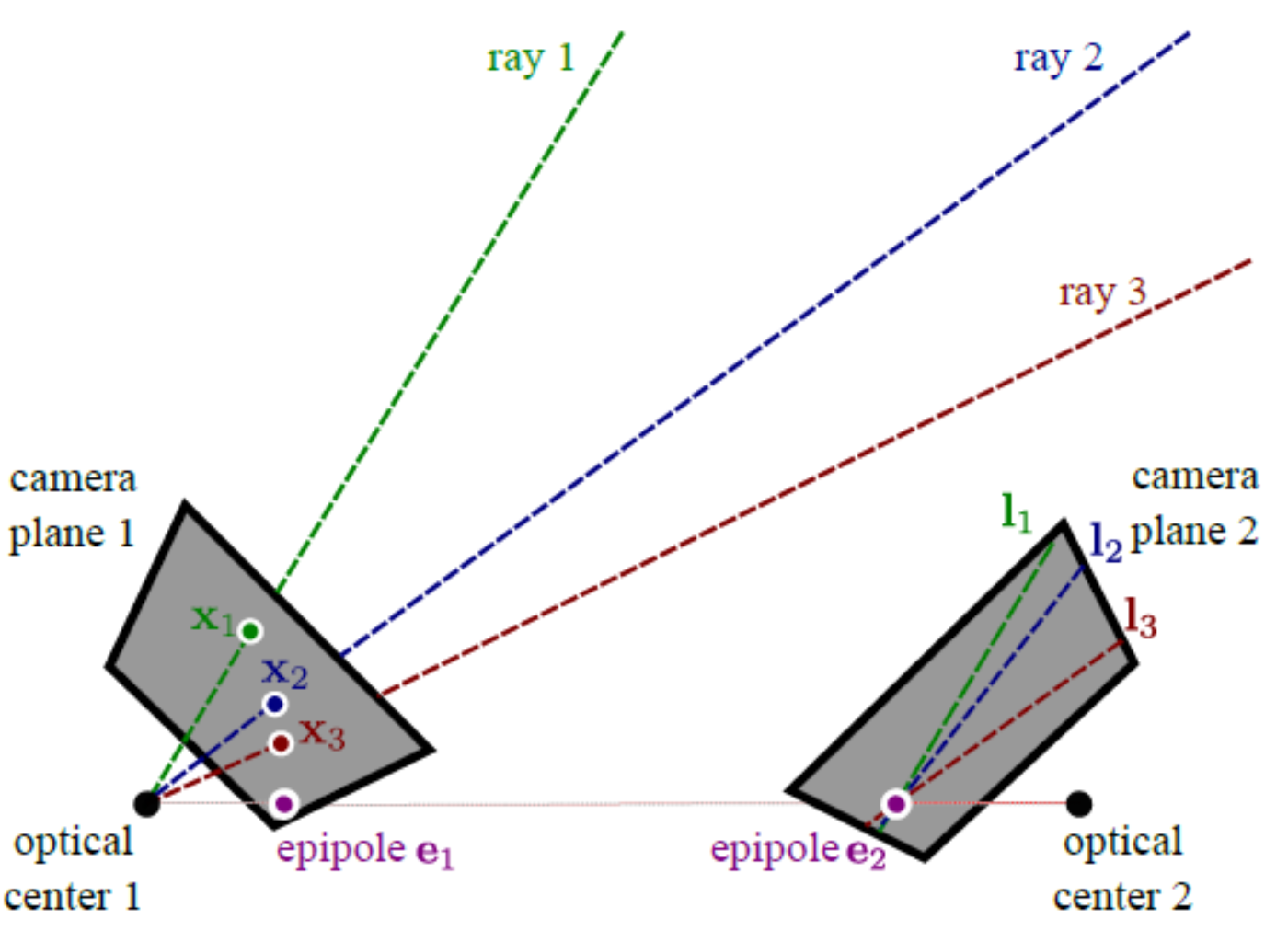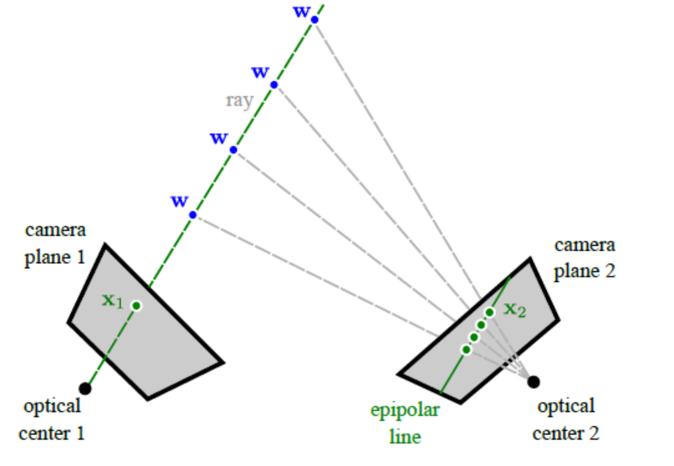 2).现在我们考虑观测同一个3D点的第二个摄像机。从第一个摄像机可得知,该点必定位于3D空间中的一条特定光线上。进而第二幅图像中该点的投影位置x2必定位于第二幅图像中这条光线投影上的某个位置。三维空间中的光线在二维空间中的投影就是所谓的极线(绿色代表的线)。