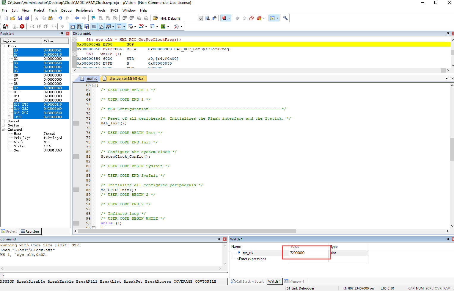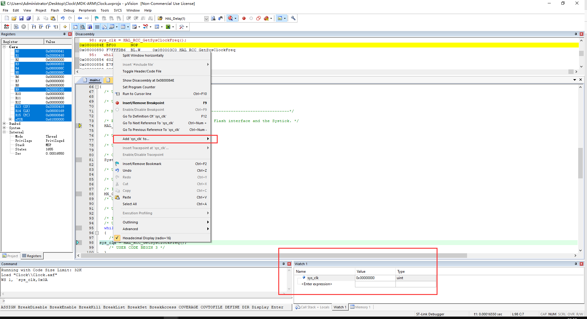 进入调试模式,在代码中 找到“sys_clk”选中,右键选择“Add ‘sys_clk’ to …”->“Watch 1”,即可在右下角显示该变量查看窗口, 可以看到当前“sys_clk”为0