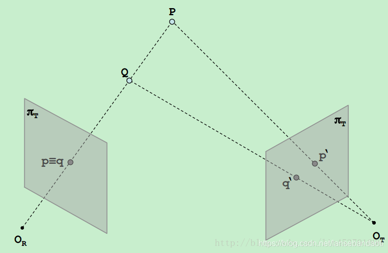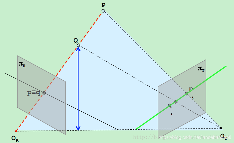 P和Q映射到左相机QR像面上的同一点p≡q,直线pq上的点对应点一定位于右像面的直线p’q’上,p’q’即为直线pq的极线,这就是极线约束。
