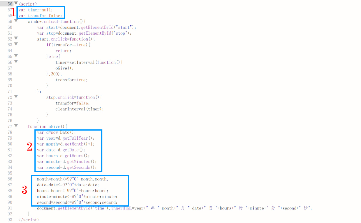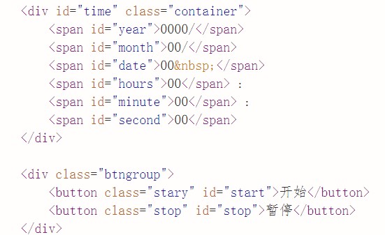 JavaScript:先声明第1中的两个变量,为什么要在这里声明两个变量呢?因为这个案例有个bug,就是连续点击“开始”按钮,然后再点击“暂停”按钮时不会停止,所以要在这地方声明两个变量,然后声明两个按钮的点击事件,再用if else来实现按钮的开始和暂停,第2是声明“年月日时分秒”,里面的“(month)月”为什么要+1呢?因为月的值是从0到11的,所以在这里要+1,然后第3是实现“年月日时分秒”为两位数的,最后一部分是获取HTML文档中的代码