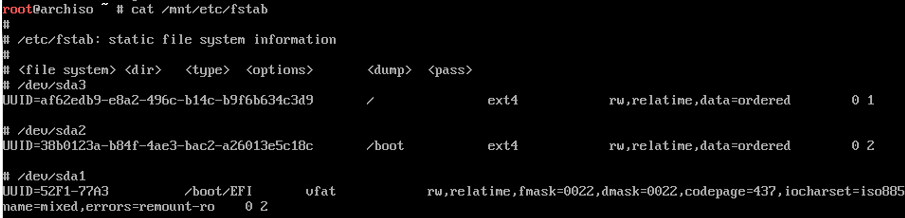 # genfstab -U /mnt >> /mnt/etc/fstab