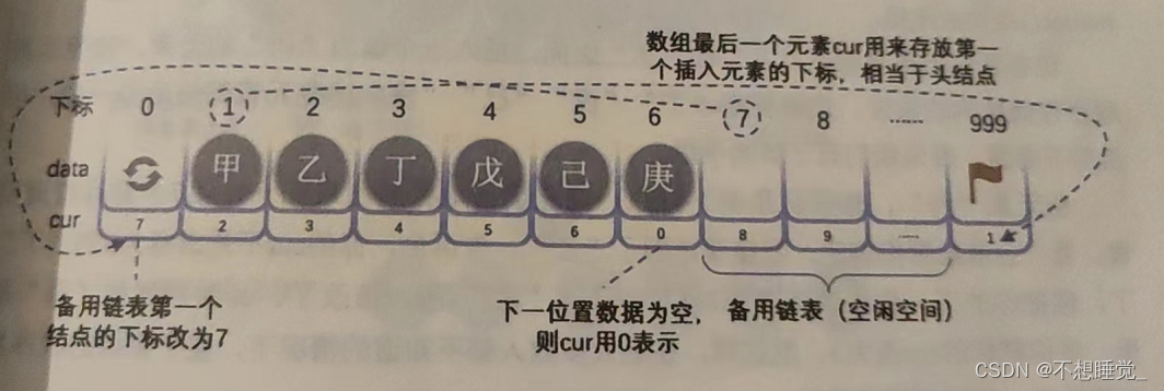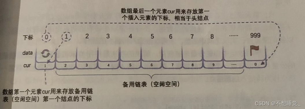 数组第一个元素,即下标为0的元素的cur就存放备用链表的第一个结点的下标