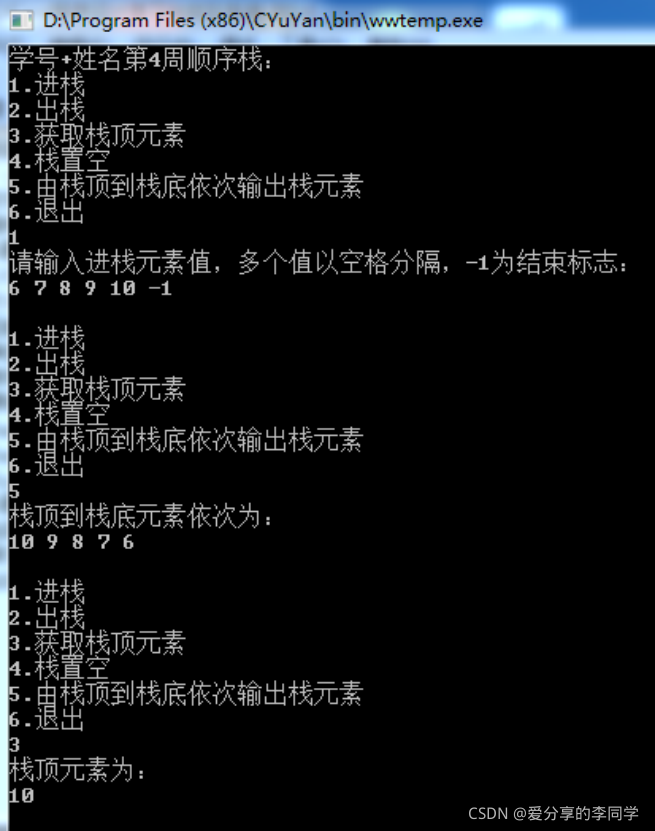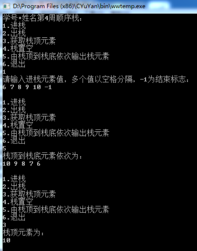 cout<<"学号+姓名第4周顺序栈:"<<endl;