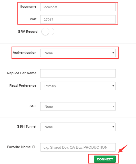 在MongoDB Compass比较简单,可以选择默认的服务器、接口和None认证,然后点击CONNECT即可: