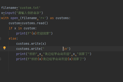 重点在于下面这个with open (文件名,打开方式)as 文件的另外一个别名 ,这个r+的意思就是我打开这个文件,之前的内容不删掉,然后如果加内容,就在后面加上就行,就像你记住了一个人之后,再记住一个人, 然后我们对我们的文件进行操作,因为我把customs作为的别名所以我用custom作为接收custom.txt里面的内容,语法就是 custom=customs.read()就是读取这个文件的内容,然后看看文件里面有没有你的名字,如果有我们就直接输出欢迎回家,如果没有我们就输出 好的+你输入的名字+我已经学会说欢迎+你的名字+回家了