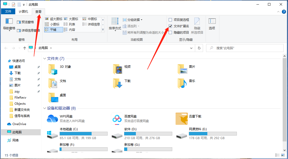 可能有的小伙伴不知道为什么他的文件不显示txt,不慌,打开此电脑再点查看把文件扩展名点上对号就ok了