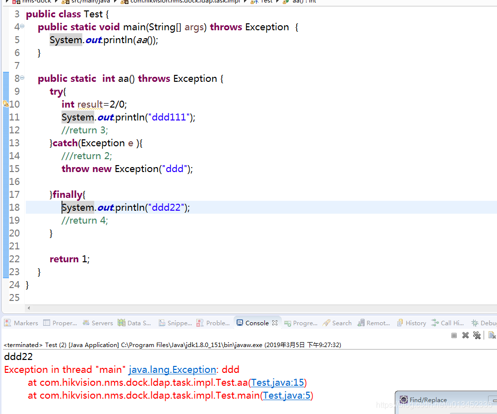 上述理论下,在try-catch-finally中不管try中的执行语句是否有异常还是有异常给抛出去了,finally中都会执行,不管任何情况finally中语句都会执行(当然是在没有强制退出程序的情况下,比如不是 System.exit(0);),在含有return的情况下,不管怎么样不会出现三个或三个以上的return的(除了,try、catch、finally都有return的情况外),因为这样会有编译报错。在finally中没有return时,出现异常且捕获了,执行catch中的return,在有异常且捕获了catch中没有return时,执行try-catch-finally外的return,在没有产生异常时执行try中的return;在出现异常且catch捕获抛出异常时,try-catch-finally的外的return不执行。