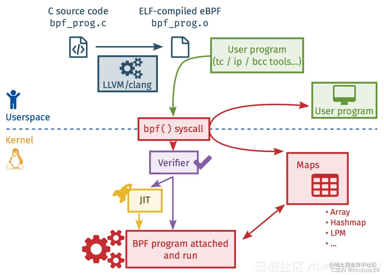 首先是将用户的.c文件编译后自动生成eBPF 字节码文件,也就是一堆的指令集合,其次通过系统调用将字节码注入到内核,然后内核验证合法性,通过校验后使用JIT将其run起来,用户程序与run起来的eBPF程序使用内核提供的标准Maps做数据交换。