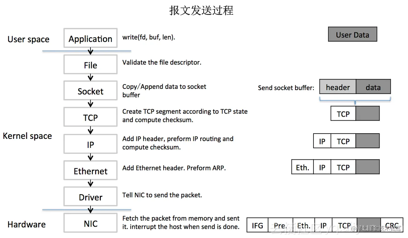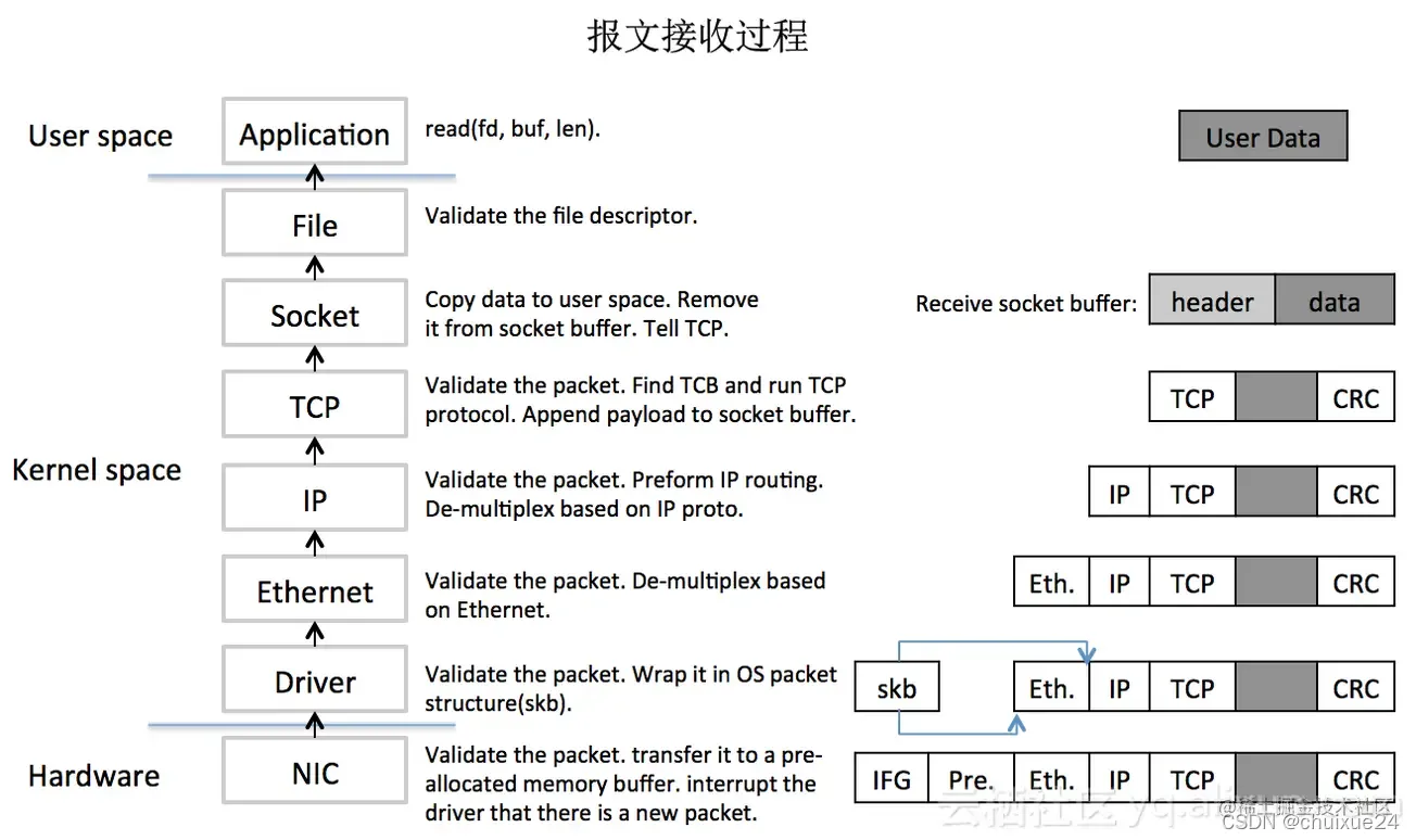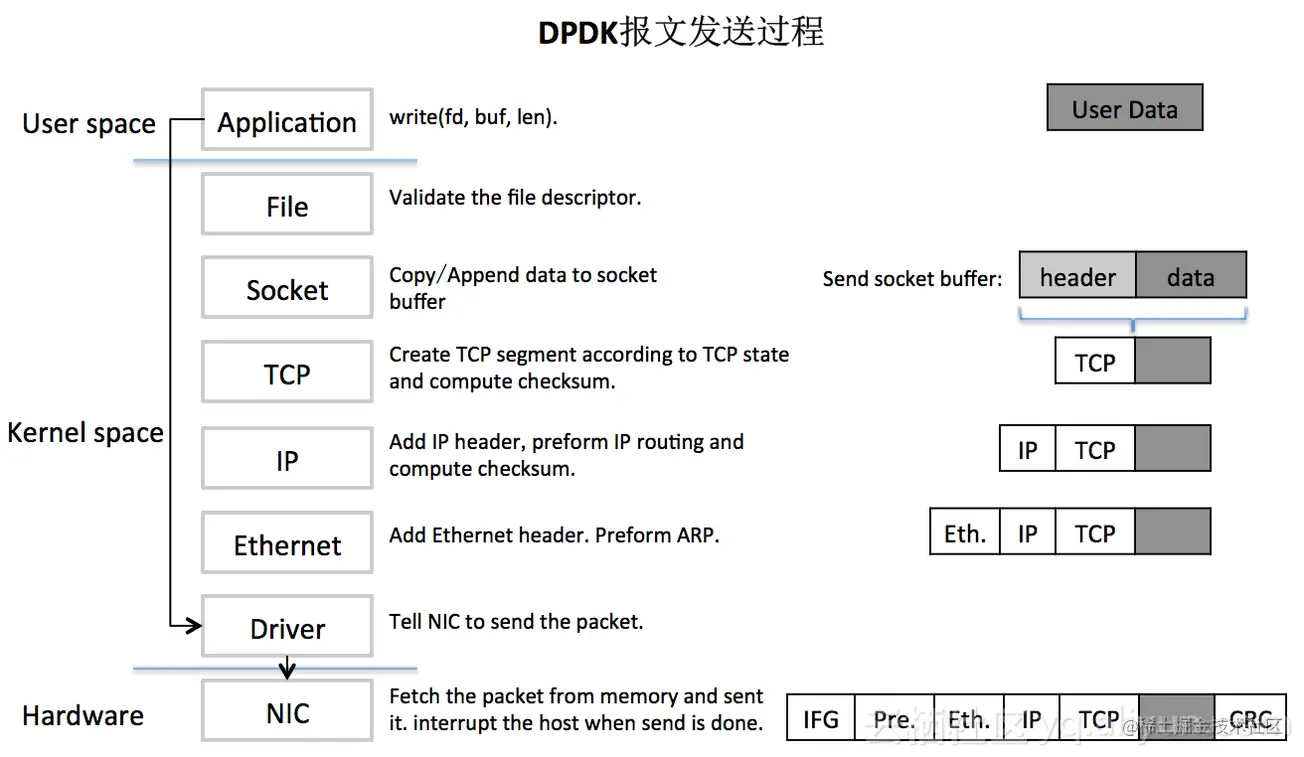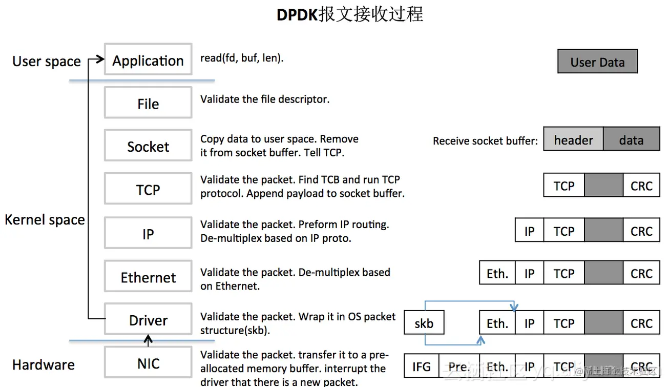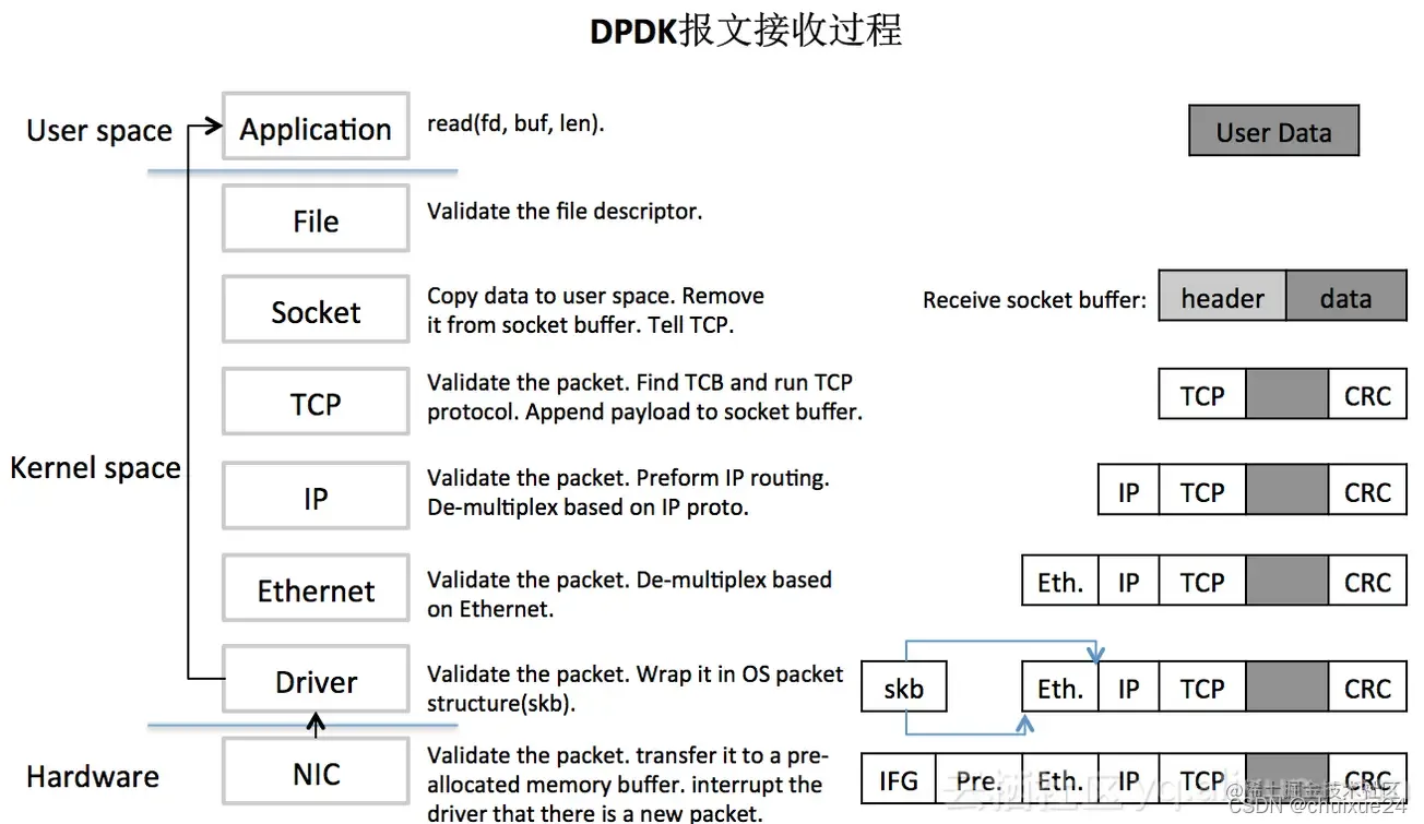 为了说清楚DPDK是如何大幅提升了数据包的处理性能,我们先看一下普通的数据包在Linux中的收发过程,如下图: