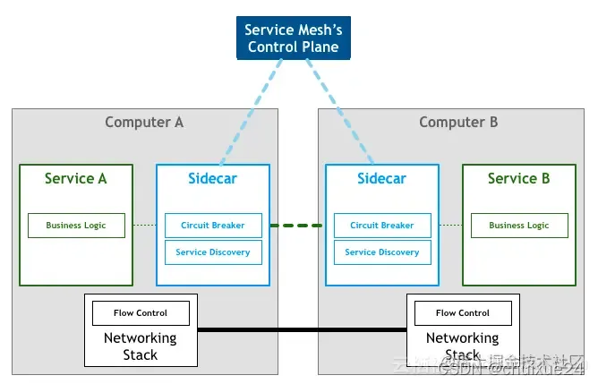 上述所说的这个服务间通讯层就是Service Mesh(国内通常翻译为服务网格),它可以提供安全、快速、可靠的服务间通讯。如果用一句话来解释什么是Service Mesh,可以将其比作微服务间的TCP/IP层,负责服务之间的调用、限流、熔断和监控等。