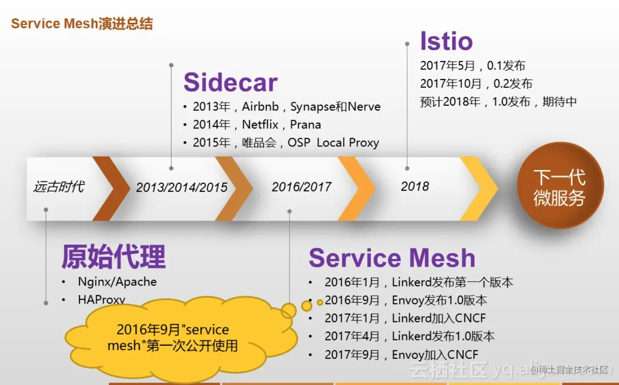 读到这里大家一定仍然存在这样的疑惑,Service Mesh到底是什么呢?这是一个全新的东西吗?它的演进过程是什么样的呢?下面使用一张图来说明其演进过程,如下: