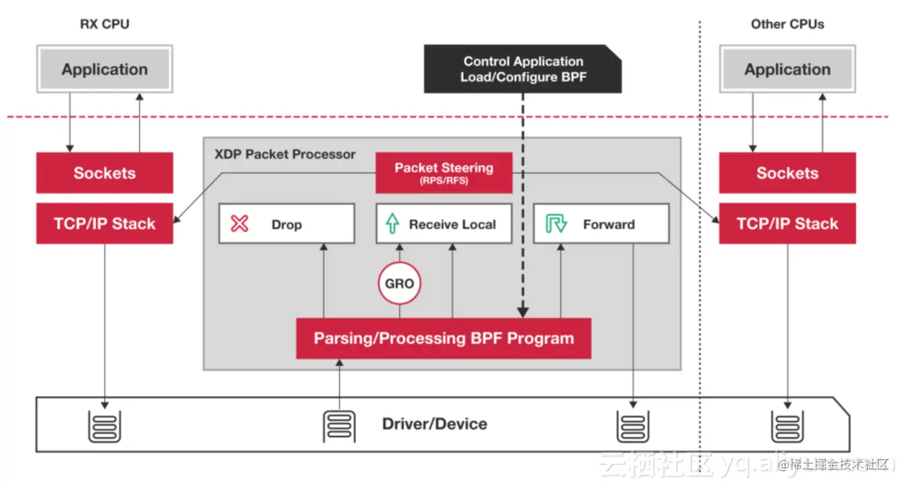 XDP在Linux内核4.8中引入,在数据包到达协议栈、分配sk_buff之前拦截,不同于DPDK的是XDP是作为内核功能的一部分,是与内核协同工作的。其基本处理流程如下图: