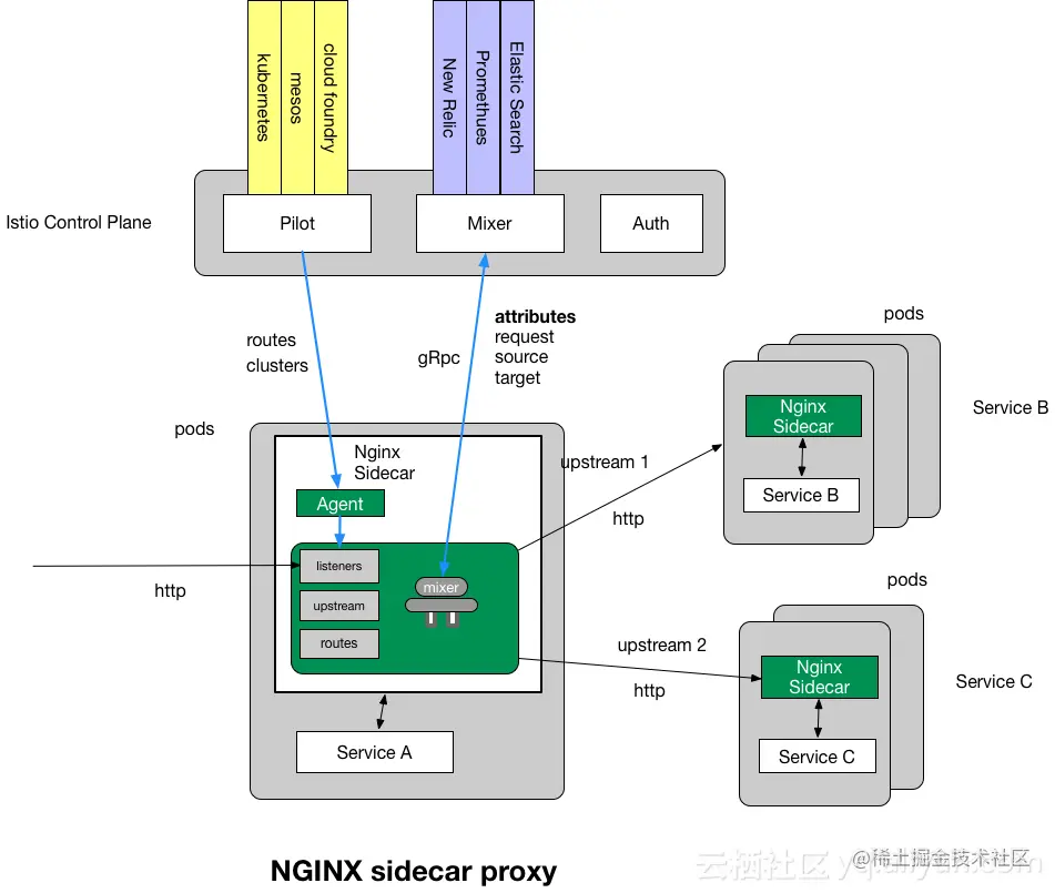 - Sidecar实现模式:agent + nginx,agent负责监听Istio的配置变化(例如路由规则、集群信息、服务发现等),并将其转换为nginx的配置,然后通过重启nginx应用配置。