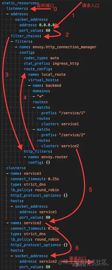 Envoy配置的简单配置信息如下: