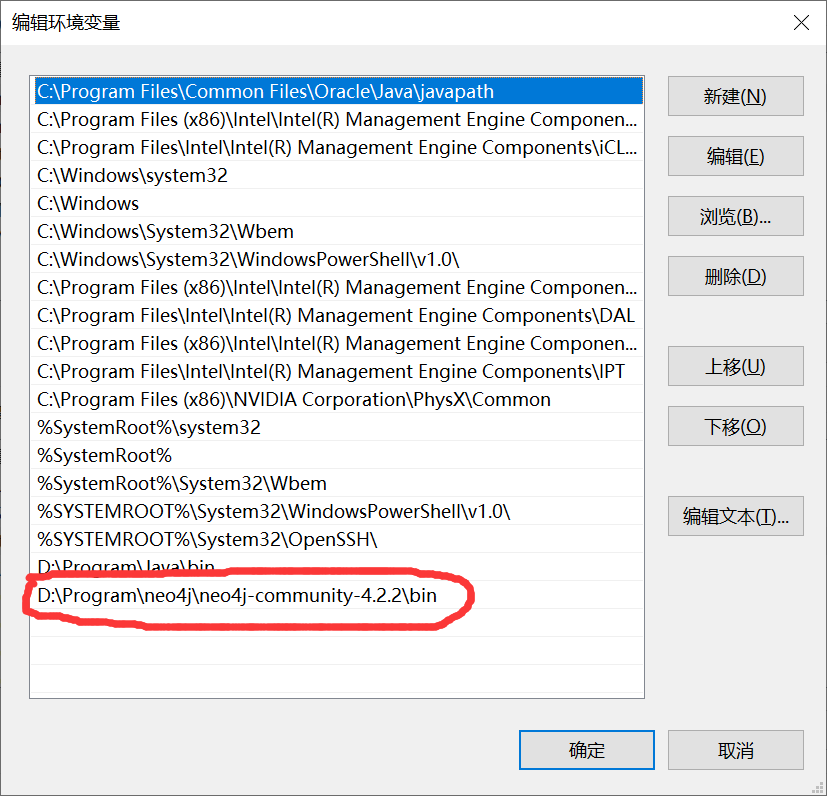 编辑系统变量Path,添加Neo4j的bin目录所在路径