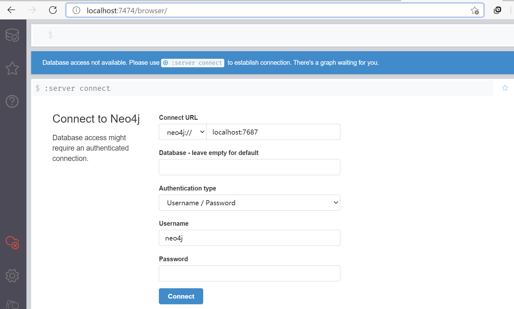 可以通过 http://localhost:7474/browser/ 访问Neo4j 数据库,初始用户名和密码均为: neo4j