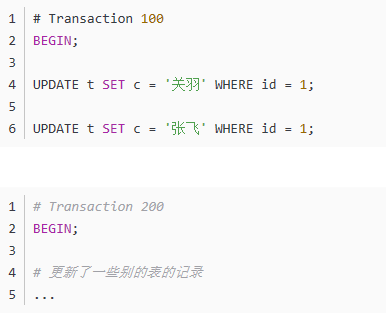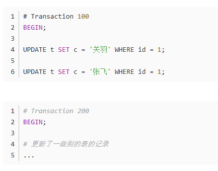 比方说现在系统里有两个id分别为100、200的事务在执行:
