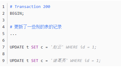 然后再到事务id为200的事务中更新一下表t中id为1的记录: