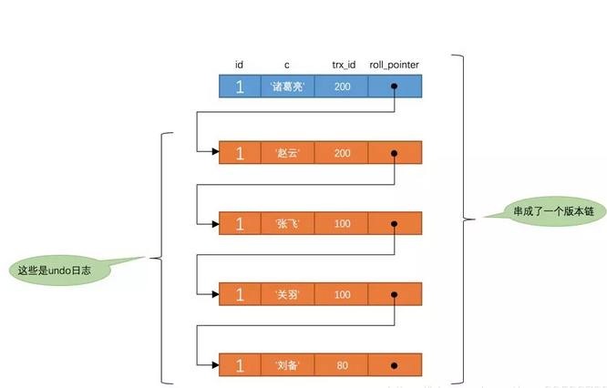 每次对记录进行改动,都会记录一条undo日志,每条undo日志也都有一个roll_pointer属性(INSERT操作对应的undo日志没有该属性,因为该记录并没有更早的版本),可以将这些undo日志都连起来,串成一个链表,所以现在的情况就像下图一样: