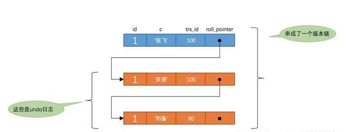 2)然后从版本链中挑选可见的记录,从图中可以看出,最新版本的列c的内容是'张飞',该版本的trx_id值为100,在m_ids列表内,所以不符合可见性要求,根据roll_pointer跳到下一个版本。