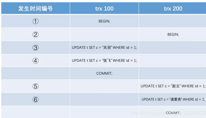 假设之后两个id分别为100、200的事务对这条记录进行UPDATE操作,操作流程如下:
