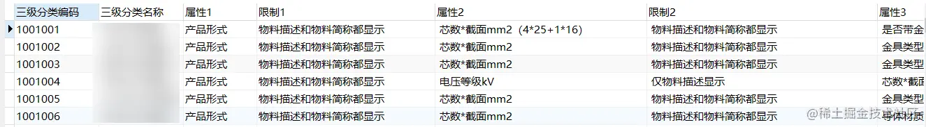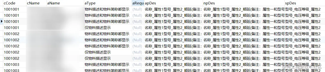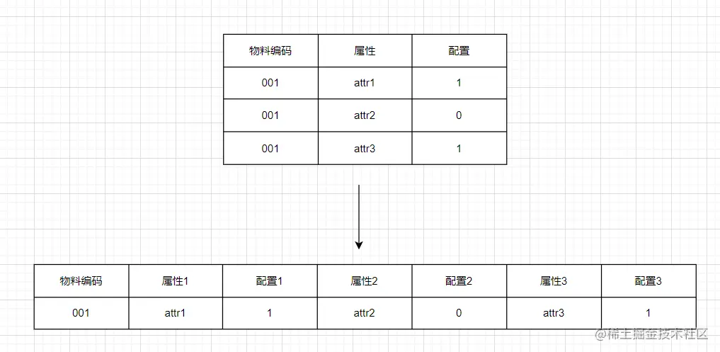 用业务上的说法,我这里有 1 个物料,其中有 n 个属性,每个属性配置有是否显示的开关,对于这个物料的 n 个属性,就是 n 条记录存储在这个表中;现在就需要对这个表按物料编码分组,分组后的数据,提取出物料的属性和配置,作为单条记录显示,画一个大概的示意图