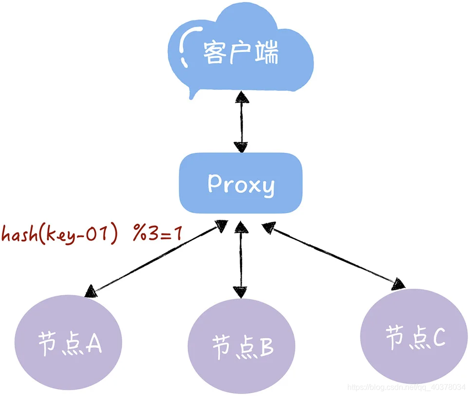假设有一个由A、B、C三个节点组成的KV服务,每个节点存放不同的KV数据。通过哈希算法,每个key都可以寻址到对应的服务器,比如,查询key是key-01,计算公式为hash(key-01)%3,经过计算寻址到了编号为1的服务器节点A