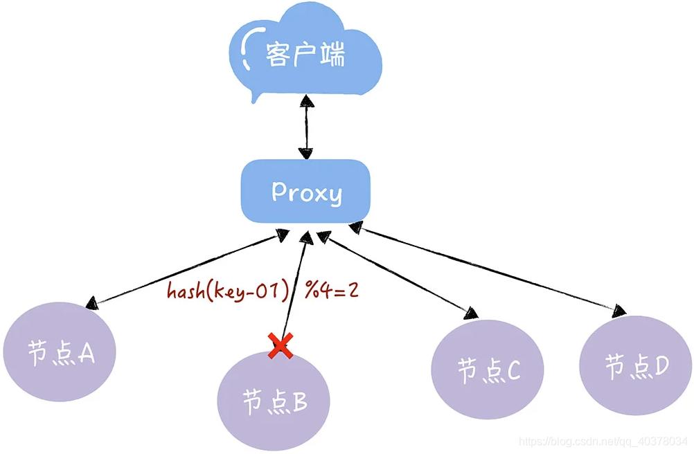 假如3个节点不能满足业务需求了,这时增加了一个节点,节点的数量从3变化为4,那么之前的hash(key-01)%3=1就变成了hash(key-01)%4=X,因为取模运算发生了变化,所以这个X大概率不是1(假设是2),这时再查询就会找不到数据了,因为key-01对应的数据存储在节点A上