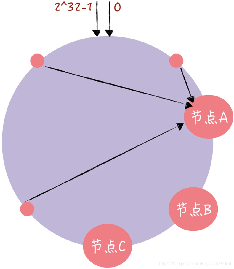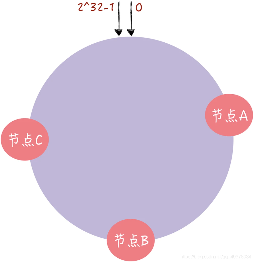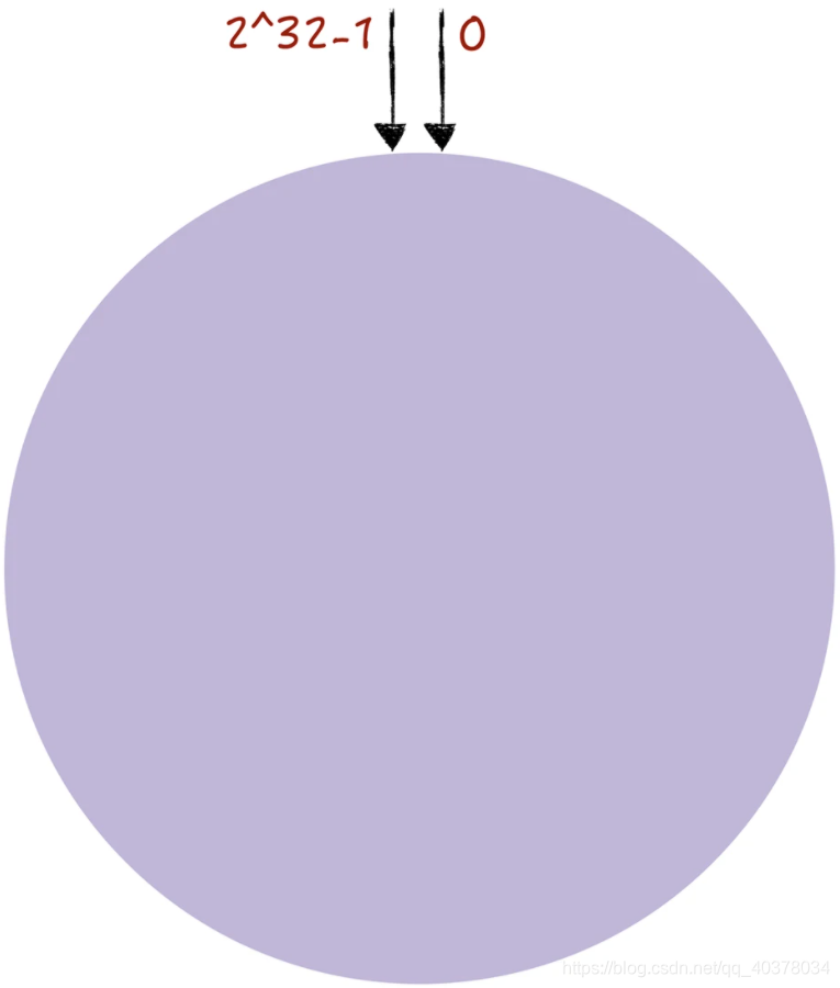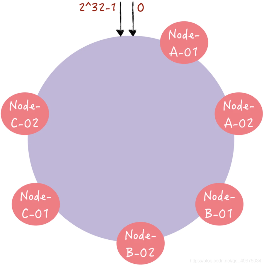 哈希环的空间按照顺时针方向组织,圆环的正上方的点代表0,0点右侧的第一个点代表1,以此类推直到2 32 − 1 2^{32}-1232−1,也就是说0点左侧的第一个点代表2 32 − 1 2^{32}-1232−1