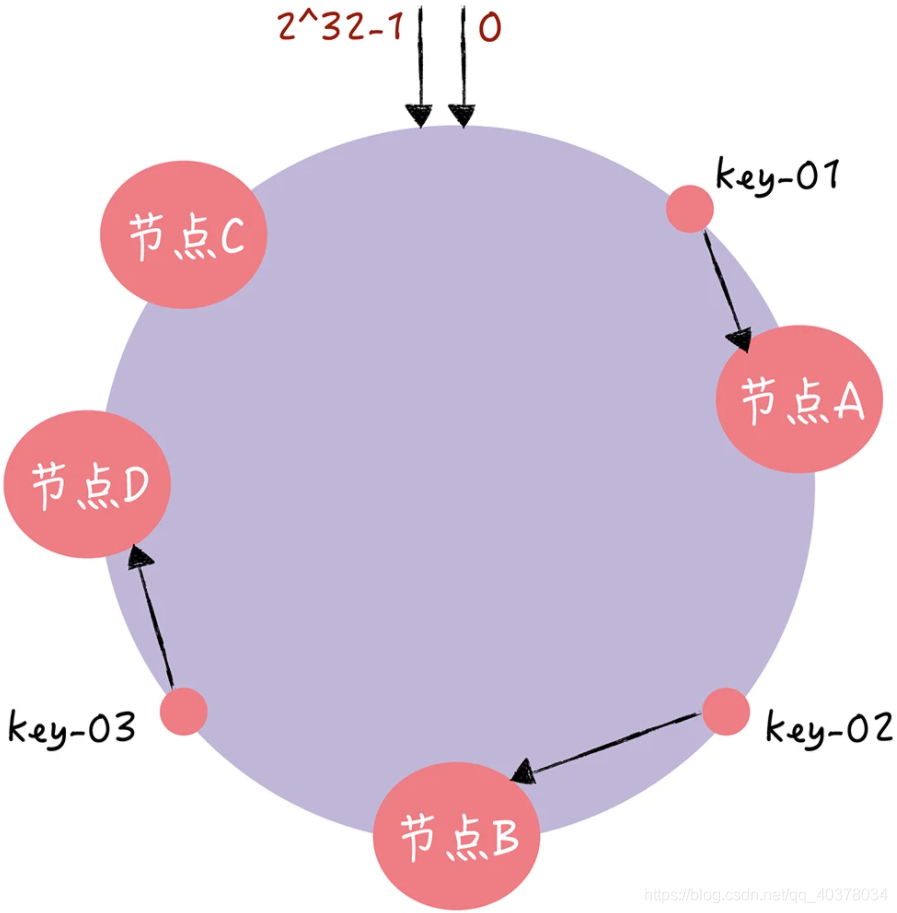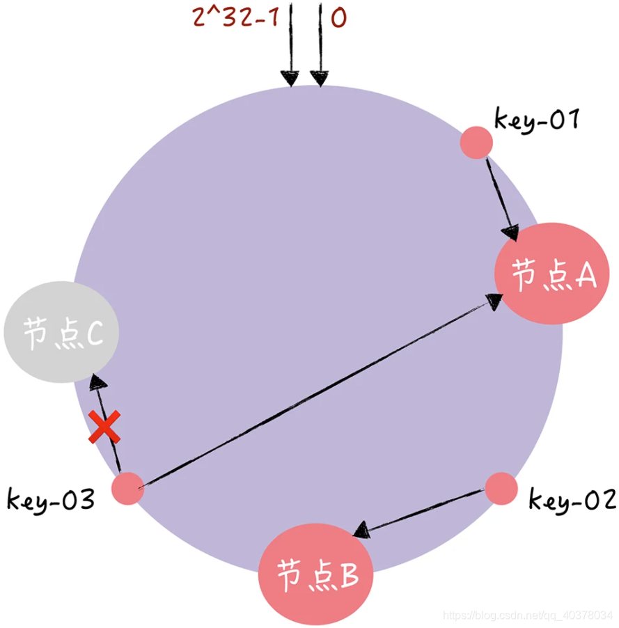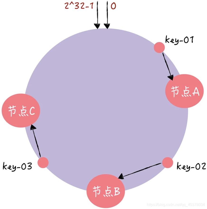 根据一致性哈希算法,key-01将寻址到节点A,key-02将寻址到节点B,key-03将寻址到节点C